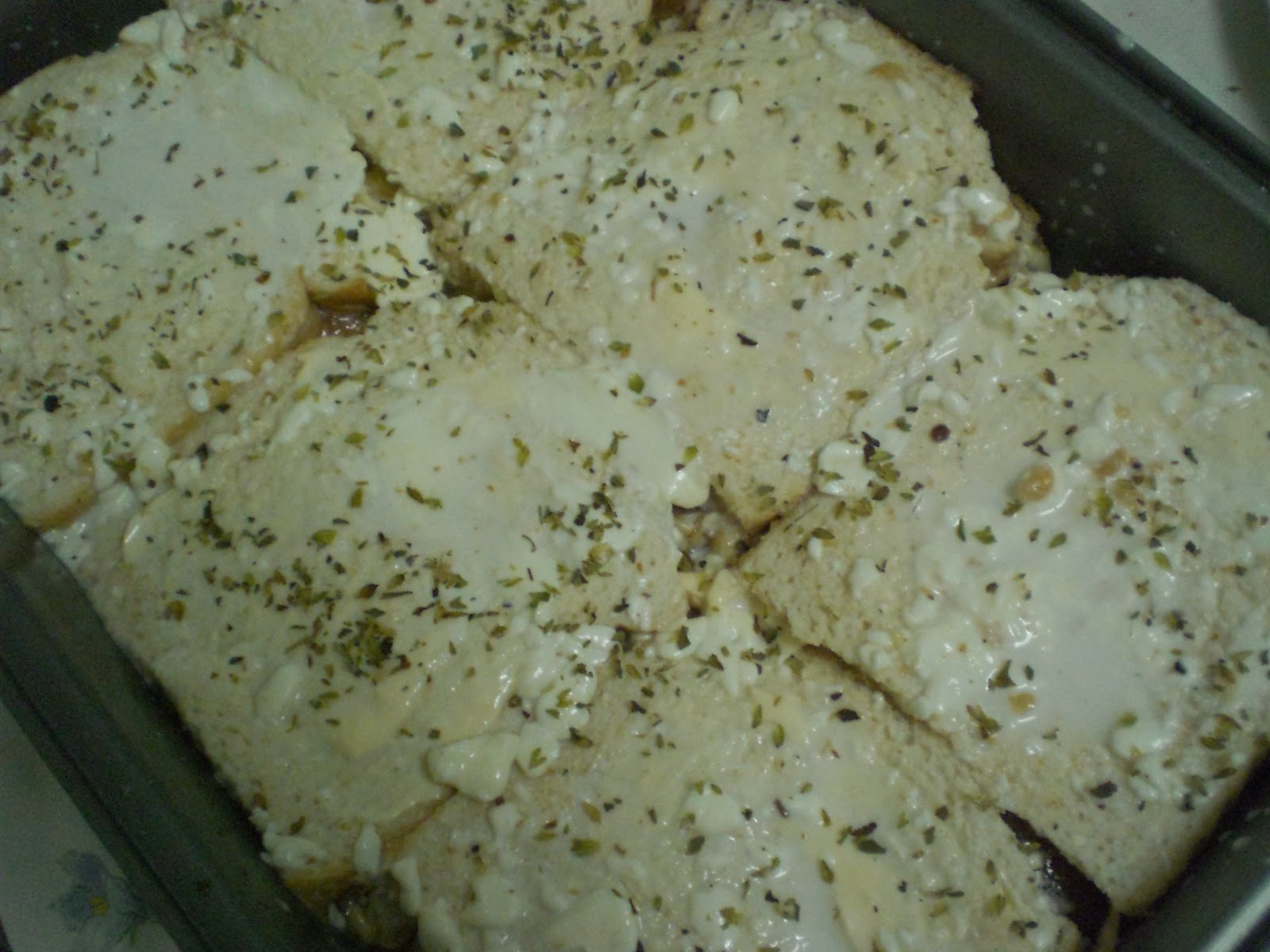 Utilizei uma forma média onde foram colocadas 12 fatias de pão de forma, 6 na primeira camada e 6 na segunda. Primeiro unte a forma com azeite, e coloque as fatias de pão de forma lado a lado. Passe maionese sobre essas fatias e coloque o queijo e presunto ralado. Coloque o tomate, e salpique orégano. Cubra com as fatias de pão de forma e passe maionese por cima. Misture bem o leite com o requeijo até dissolver bem, e coloque por cima do sanduíche de forno. Salpique orégano e leve ao forno por 30 minutos até dourar. Sirva bem quentinho!
